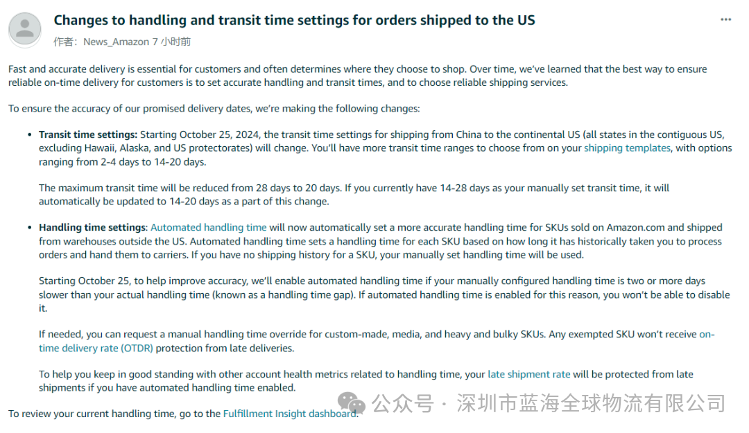 8月29日,亚马逊美国站对从美国境外发货的订单运输和处理时间设置进行了修改。公告截图如下: