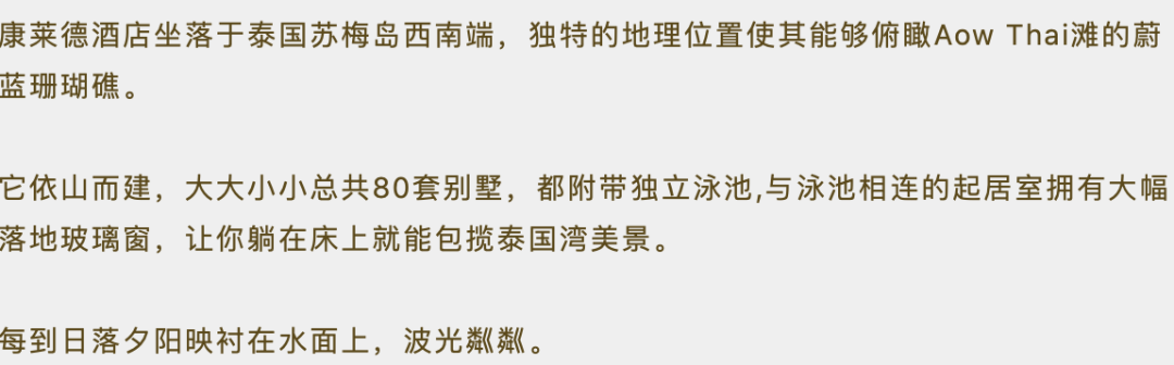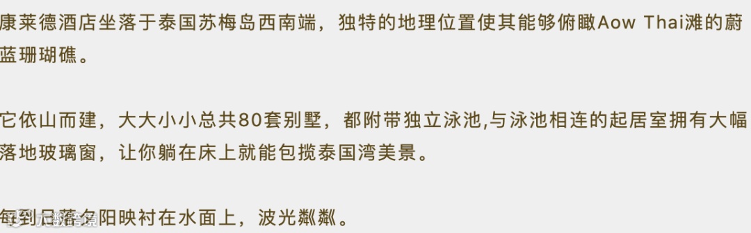 苏梅岛康莱德。是康莱德全球旗下20个精致奢华的酒店之一,地处苏梅岛最西南端,在一处与世隔绝的悬崖上。