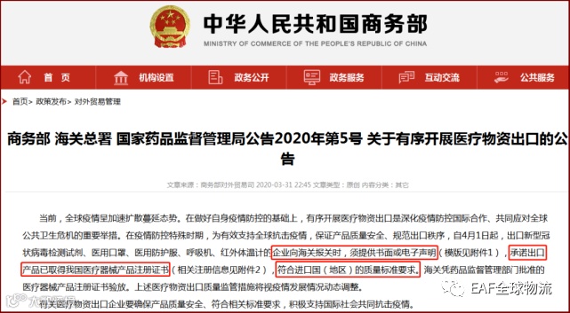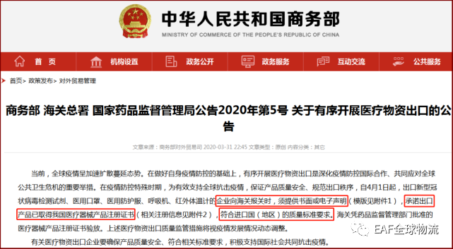 商务部,海关总署,国家药品监督管理局,发布公告,要求:自4月1日起,出口新型冠状病毒检测试剂、医用口罩、医用防护服、呼吸机、红外体温计的企业向海关报关时,须提供书面或电子声明,承诺出口产品已取得我国医疗器械产品注册证书,符合进口国(地区)的质量标准要求。海关凭药品监督管理部门批准的医疗器械产品注册证书验放。