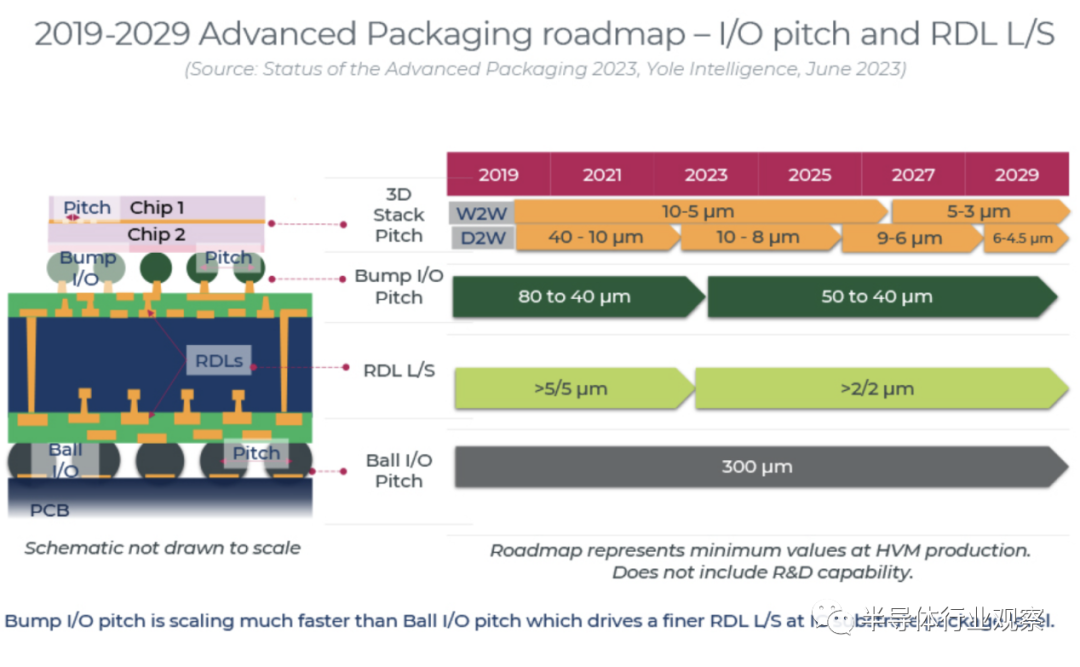chiplet 方法 将 SoC 芯片划分为多个芯片,仅缩放具有先进技术节点的芯片,并使用 2.5D 或 3D 封装将它们集成。这提高了产量并降低了成本。混合键合 (HB:Hybrid Bonding) 是另一个 重要趋势,可实现金属-金属和氧化物-氧化物面对面堆叠,且凸点间距小于10 µm。它用于 CIS 和 3D NAND 堆叠等应用的晶圆到晶圆混合键合,以及用于 PC、HPC 和数据中心的逻辑上内存堆叠 3D IC 中的 3D SoC 的持续开发。