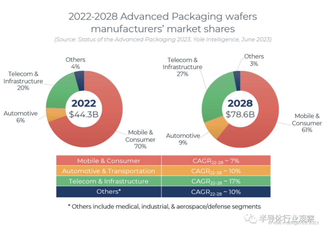尽管传统封装目前主导晶圆生产,到 2022 年将占总产量的近 73%,但 AP 市场的份额正在逐渐增加。AP晶圆的市场份额预计将从 2022年的约27%增长到2028年的32%。按单位计算,传统封装占据超过94%的市场份额,但AP在2022年到2028年的出货量预计将以约6%的复合年增长率增长,这意味着到2028年达到1010亿单元出货量。