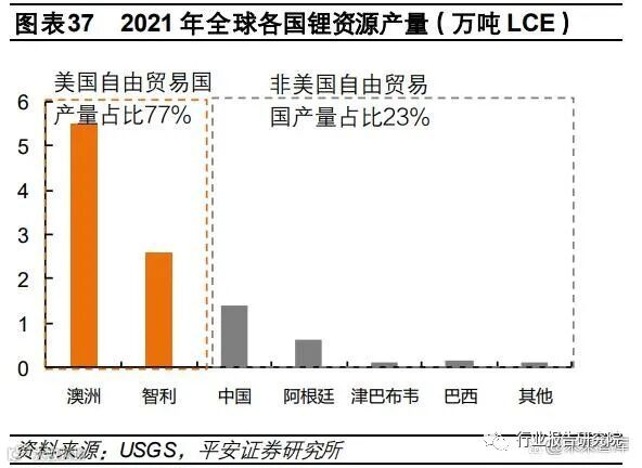 具体来看,美国于8 月中旬颁布《通胀削减法案》,规定享有消费补贴的电车电池关键矿物材料 40%需在美国或与美国签 署自由贸易协定的国家生产加工。对上游锂资源的影响来看,美国与其自由贸易国家锂资源储量及产量在全球的占比超 70%,现有锂资源主要供应地澳大利亚和智利均和美国签有自由贸易协定,而我国当前的锂资源仍有较高的对外依存度, 不存在出口美国的部分,因此该政策对资源端供应局势的影响较小。其次,对我国锂盐出口的影响来看,我国主要出口氢 氧化锂产品,其中 95%以上出口至东亚各国,韩国和日本分别占 55%和 40%左右,对美国出口占比有限。电池环节来看, 我国新能源产业链享有先发优势,供应链成熟,规模及成本优势突出,短期内难以被替代。但长期来看,海外政策推动下, 部分海外国家锂电产业链将逐步完善,全球锂资源竞争或进一步加剧。