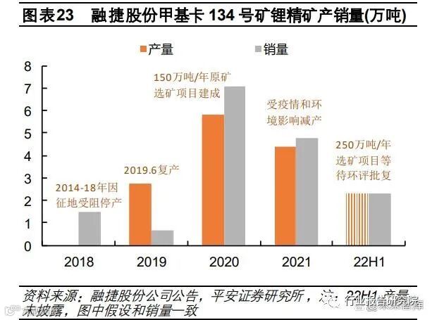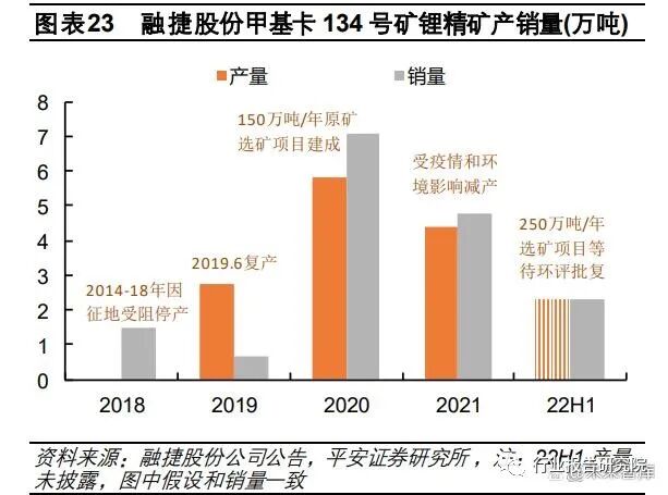 四川甲基卡 134 号锂辉石矿(融捷股份持股 100%):目前采矿产能为 105 万吨/年,选矿产能为 45 万吨/年,公司根据选 矿厂的生产能力开采原矿,折合精矿产能为 7-8 万吨。计划建设的鸳鸯坝 250 万吨/年锂矿精选项目目前处于环评阶段,原 计划 23H1 投产,目前尚未开始主体工程的建设。四川李家沟锂辉石矿(川能动力持股 62.75%,雅化持股 37.25%):目前每天出矿 600 吨原矿,项目投产后日采选能力为 4200 吨,年采选能力 105 万吨,约 18 万吨锂精矿,优先供应雅化集团控股的国锂公司。截至 22Q3,已实现部分基建出 矿累计 6 万余吨,井巷工程完成率 85%,地表采选、尾矿库、生产辅助设施和生活设施等按计划正常推进,同时,公司将 加大人力物力加快尾矿库的建设。