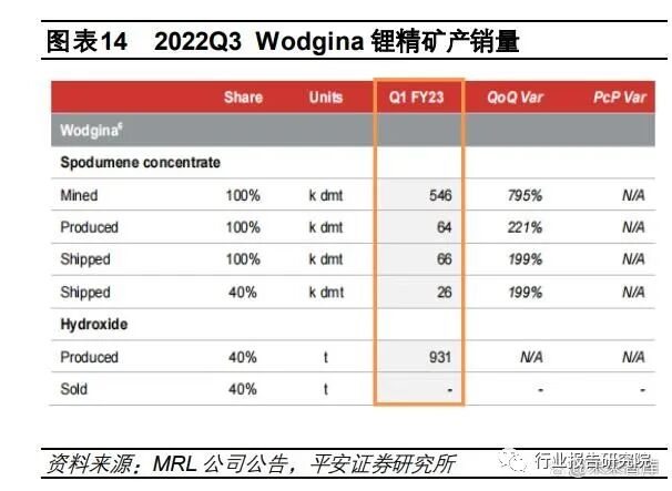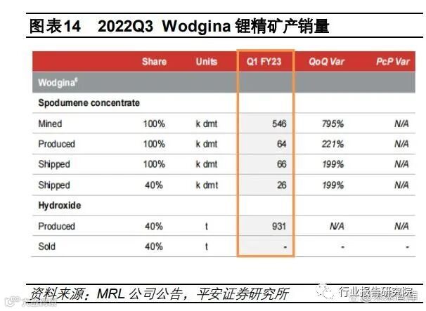 澳洲 Wodgina 锂辉石矿(ALB 和 MRL 各持股 50%):第一条产线(产能 25 万吨/年 Li2O@6%精矿)于 2022 年 5 月正式 复投产,22Q2 产出 2 万吨锂精矿;7 月份,2 号产线也开始生产(产能同 1 号),22Q3 锂精矿产量达6.4 万吨,环比 +221%,发运量 6.6 万吨,环比+199%;3 号产线(产能同 1 号)计划 2022 年 12 月投产,具体视需求而定。此外,ALB 通过 Kemerton 工厂转化了 7000 吨 Wodgina 锂精矿,首次产出 931 吨氢氧化锂,将在 2023 年第二季度出售。Wodgina 2023 年精矿销量指引:38-42 万吨(按照 MRL 披露的 23 年产量指引*2 计算得)。澳洲 Ngungaju 锂辉石矿(Pilbara 持股 100%,原 Altura 旗下项目):21Q2 Pilbara 董事会通过 Ngungaju Plant 重启规划, 22Q3 售出首批锂原矿 4.5 万吨,但选矿厂未建设完毕,精矿产能仍无法释放,暂时以原矿销售,售价 495 美元/吨(CIF 中国),产品的氧化锂品位 1.2%左右,回收率处于 60%中位数水平。整体来说,项目进展顺利,符合预期。计划将在 2022 财年 12 月重新开始精矿运营,产能规划 18-20 万吨/年(停产前单季度精矿产量均值约 4.5 万吨)。澳洲 Bald Hill 锂辉石矿(Alita 破产重组,Austroid 收购进行中):Alita 公司 7 月中旬公告,已开始在 Bald Hill 进行预处理, 工厂大约需要 6 个月才能满负荷运转,通过预处理可得到氧化锂品位 5%以下的精矿。加拿大 North American Lithium 锂辉石矿(Sayona 持股 75%,Piedmont 持股 25%):Sayona于今年 10 月宣布启动PFS, 计划于 2023Q1 重新启动该项目的生产,截至 10 月采购完成 98%,许可审批完成 96%,新增的管理和员工也将投入工作 中,Sayona 的目标是生产 220kt Li2O@6%的锂辉石精矿(30kt 碳酸锂当量)。