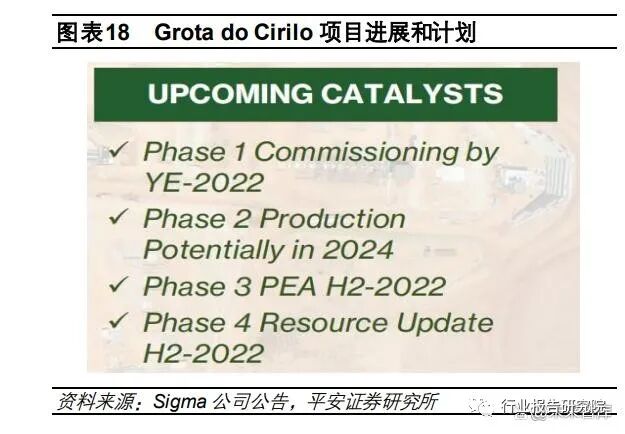 巴西 Grota do Cirilo 锂辉石矿(Sigma Lithium 持股 100%):项目处于在建阶段,按计划正常进行,已完成矿山预剥离, 并于 2022 年 11 月开始采矿,一期 27万吨/年锂精矿(5.5%Li2O)的矿石破碎工厂拟于 2022年底试运行,2023 年 4月实 现商业化生产,23Q2 之前实现收入。此外,Sigma 拟将该项目的二期(26.1 万吨/年锂精矿)和三期合并,合并后年产能 为 49.8 万吨精矿,计划 2024 年投产,届时目标年产量将提高近三倍,产能达到 76.8 万吨锂精矿,约10 万吨 LCE。加拿大 James Bay 锂辉石矿(Allkem 控股):计划通过一个主要利用水力发电的选矿厂,在 19 年的项目寿命中生产约 32 万吨/年的锂精矿。目标是在 2023Q1 开始施工,并在 2024 年上半年后期试运行。22Q3,该项目配套所需输电线和变电站 已由魁北克水电公司建成,同时 James Bay 选矿厂获得施工许可,初步现场工程已展开,详细工程和采购活动将跟进。