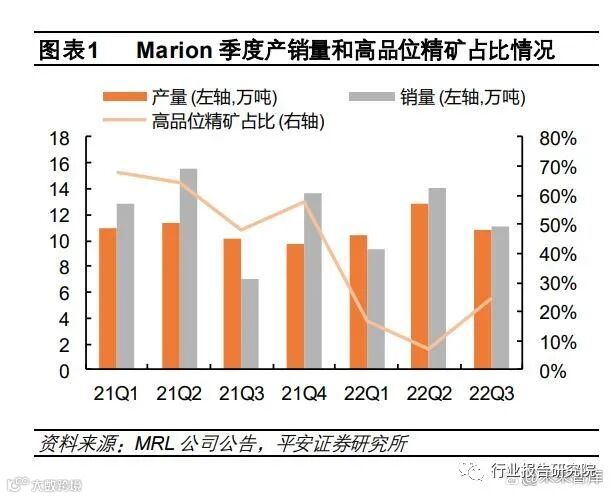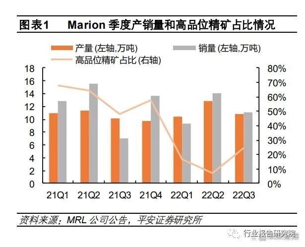 由于前期的大规模开采,成熟澳矿 Pilgangoora、Cattlin 和 Marion 均已出现生产的精矿品位明显下降的情况,折合 6%氧 化锂品位的精矿供应实际增量不及预期。其中,2022 年前三季度 Pilgangoora 精矿产量合计 35.6 万吨,但氧化锂平均品味降至 5.3%(此前的品位指引在 5.7%- 6%),折 6%的精矿产量实际约为 32 万吨,而今年 Q1 Pilgan 工厂改扩建以来的理论产能为 36-38 万吨/年。Cattlin 生产精矿品位呈现较为明显的环比下行趋势,从 21Q1 的 5.8%降至 23Q3 的 5.3%。今年 8 月底,西澳大利亚州持 续的劳动力和设备短缺导致 2NW 矿预开采推迟,加上暂时不利的细粒矿化, Cattlin 更是下调了 2023 财年精矿的预测产 量至 14 -15 万吨(22Q2 对预测为 16-17 万吨)。Marion 受疫情、设备检修和开采低品位过渡锂矿、扩产项目暂时性停工等因素影响,22Q3 精矿产量环比下降 15%,其中 24.9%是高品位精矿产品,较 22Q2 仅 7.1%的高品位精矿占比有所上调,但较去年同期 47.9%的高品位精矿占比下降明显。根据 MRL 的销量指引,预计 2022 年Marion 矿山产出精矿的全年发货量在 58.8-64.7 万吨,高品位精矿占比 40%。