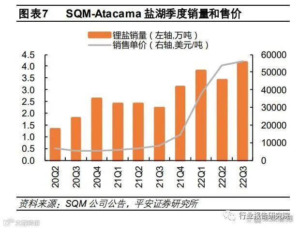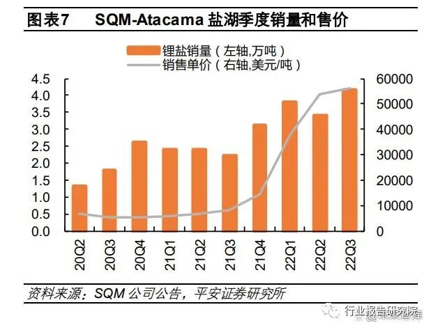 在产盐湖增产项目:智利 Atacama 盐湖(SQM):22Q3 实现销量 4.16 万吨,同比增加 89.09%,环比增加 22.35%,均价超 5.6 万美元/吨 (22Q2 为 5.4 万美元/吨),实现销售收入 23.35亿美元,同增 11.6 倍,实现毛利 14.31 亿美元,同增 16.5 倍。SQM 今年 1-9 月累计实现锂盐销量 11.38 万吨,营收56.29 亿美元,同增 10.6 倍。同时,SQM 进一步上调 2022 年全年锂盐销量指引,由二季报中提及的全年指引超 14.5万吨上调至超 15 万吨,并且 2022 年销量均已订购完,即 22Q4 将销售 3.62 万吨以上锂盐产品。
