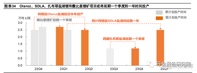 受劳动力和设备、能源短缺等因素影响,部分项目无法按计划时间投产。特别是盐湖锂项目,受到盐湖流动和卤水蒸发影 响,卤水锂库存下降和浓度降低的情况较多,因此环评周期长,且对技术和设备的要求更高,项目出现进程放缓和延期投 产的概率较大,产能也极大可能不及预期。延期投产的盐湖锂项目:阿根廷 Olaroz 二期规划产能 2.5 万吨/年因关键管道和电气设备、能源等受限,延迟至 23Q2 投产 (此前预计 2022 年 12 月投产);阿根廷 SDLA 原计划 23Q1 建成 2.5 万吨 LCE 年产能,但因环评未获批,一期一万吨产 能的吸附设备被放在智利港口,建设仍未开始;我国的西藏扎布耶盐湖原计划二期电碳 9600 吨/年、工碳 2400 吨/年在 2023 年 7 月 30 日建成,2023 年 9 月 30 日投产,目前因配套的光热光伏项目进度落后,预计将延期至 2023 年底建成。此外,盛新锂能控股 51%的津巴布韦撒比星项目规划年产锂精矿 20 万吨,受疫情及物流运输影响,原计划是在 2022 年底 建成投产,预计要延迟到 23Q1。