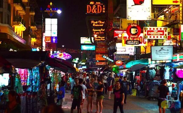 考山路是曼谷背包客云集的地方,巷子里有许多个性的小店,各店的招牌非常醒目,到了夜里这里摆卖各种廉价T-shrit、纪念品等,酒吧、街边小吃也比比皆是。夜幕降临,这里反而越发地热闹起来,小小一条街,却陷入了漫长的狂欢。