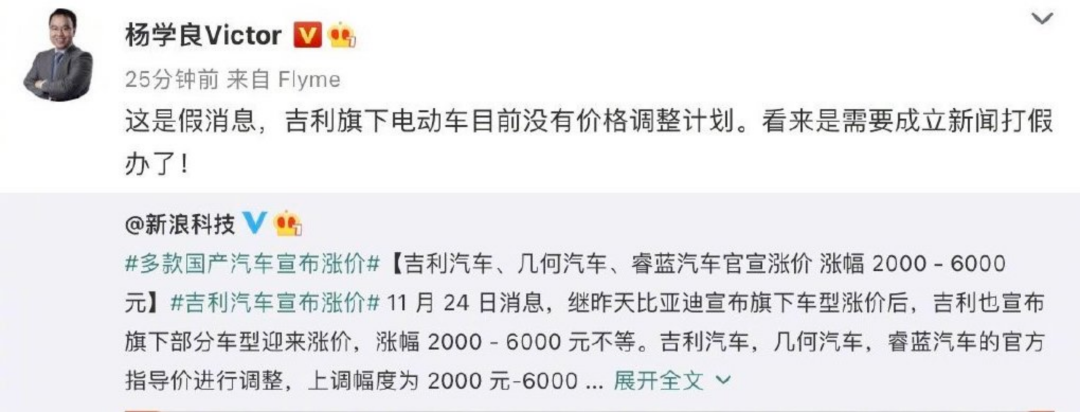 随后,吉利官方对此进行辟谣,表示不会对新能源汽车进行涨价措施。吉利汽车副总裁杨学良对北青汽车表示:“这是假消息,吉利旗下电动车目前没有价格调整计划。”(北青汽车)