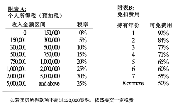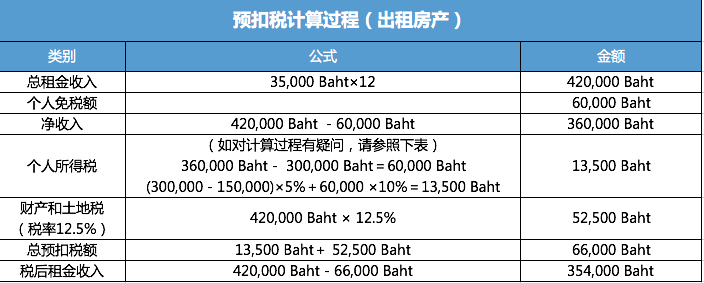 假如在持有期,屋主将房屋出租的话,那么租金收入产生的税收,应该这样计算,参照附表A,例如,平均每月房价为35,000泰铢。下表显示了出租该房屋的年度所得税计算: