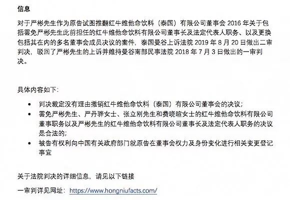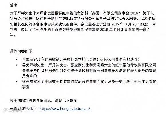 该网站9月公布的一份董事会上诉信息显示,对于严彬作为原告试图推翻红牛维他命饮料(泰国)有限公司董事会2016年关于包括罢免其此前担任的红牛维他命饮料有限公司董事长及法定代表人职务、以及更换包括其在内的多名董事会成员决议的案件,泰国曼谷上诉法院2019年8月20日做出二审判决,驳回了严彬的上诉、并维持曼谷南部民事法院2018年7月3日做出的一审判决。