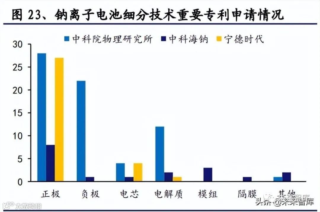 生产研发齐头并进,正极材料是重点。基于专利数量的技术发展趋势通常遵循“新 兴-成长-成熟-饱和”四个连续的阶段。开发前阶段的特点是年度专利数量呈指数 增长,而成长阶段的特点是公司已经在对技术进行整合和商业化,因此专利新增 数量下降。钠离子电池每年的专利申请数量直到 2019 年一直保持急剧增长,之后 便呈下降趋势,标志着钠离子电池技术进入成长阶段,国内机构缩减研究并聚焦 于商业化应用。从专利细分技术来看,国内的宁德时代和中科院物理所(中科海 钠)研究重点均放在正极上,中科院物理所(中科海钠)又在钠离子电池正极、 负极、电解质、隔膜、电芯、模组等技术领域均布局多项专利。