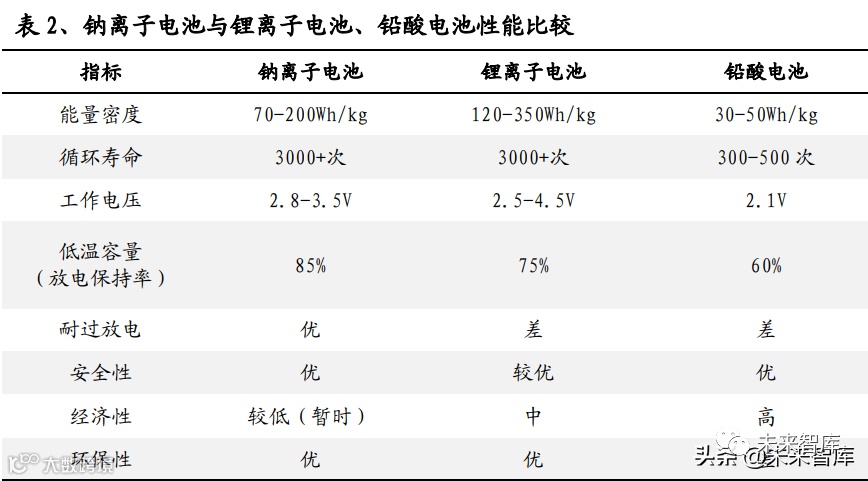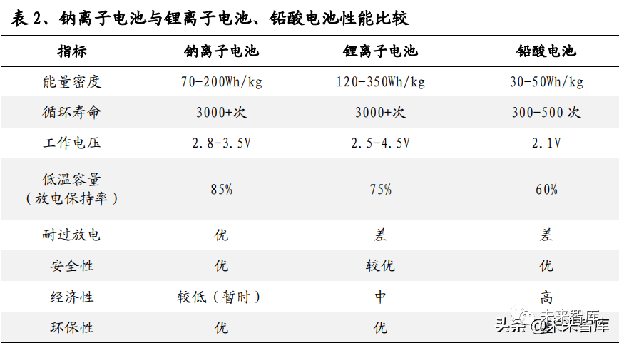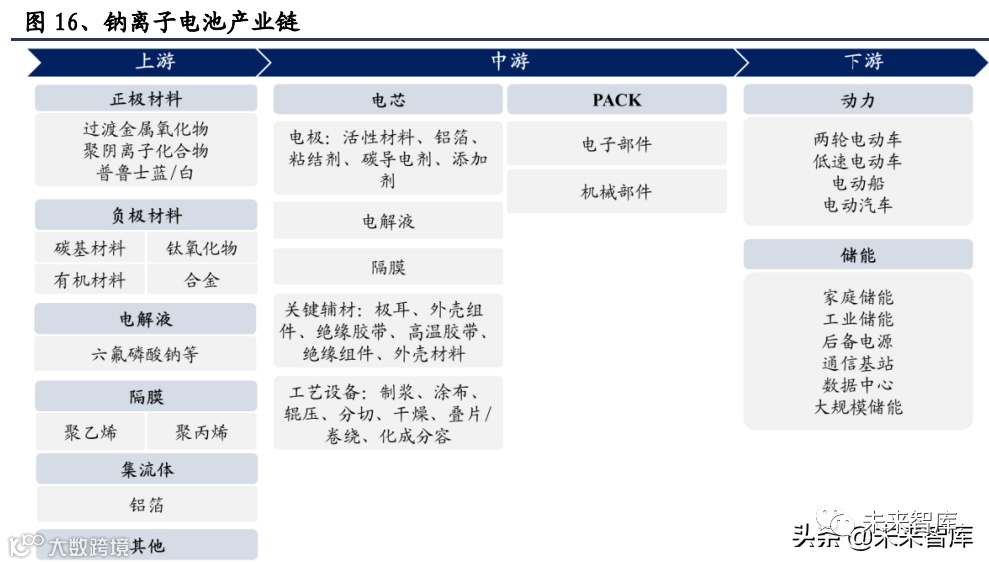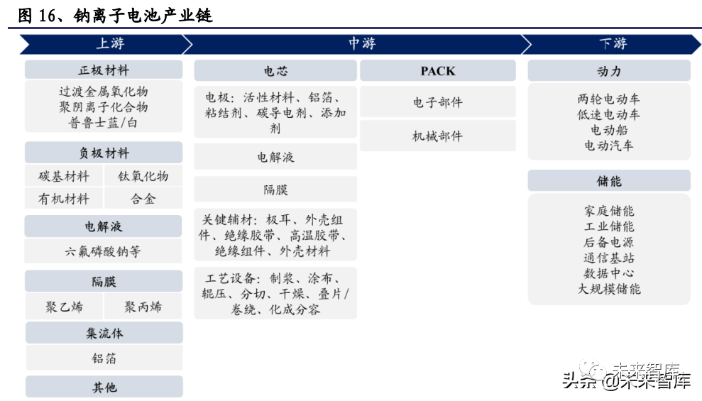 动力领域:现阶段有望以电动两轮车和 A00 级别电动汽车为主,钠离子电池难以 撼动更高级别车型。电动两轮车方面,2019 年新国标的正式实施进一步规范了电 动两轮车的生产、销售和使用管理,提高了整车质量、电池安全性和装机功率等 要求,对电动两轮车的产业结构优化起到了一定的推动作用。如果选用锂电池会 出现成本过高、质量良莠不齐的问题;钠离子电池在能满足两轮车能量密度要求 的基础上,凭借低成本和独有的快充性能和低温表现,将有可能全面终结铅酸电 池时代。电动汽车方面,钠离子电池将首先切入 A00 级别车,抢夺磷酸铁锂电池 市场。A00 级别电动汽车普遍对能量密度要求不高,且对价格相对敏感,因此钠电 池待 2023 年产业链初步成熟后将具备一定成本优势,能够开始逐步替代小微型电 动汽车的磷酸铁锂电池。在三元锂电池主导的高端动力电池领域,钠离子电池由 于存在能量密度的短板,暂时难以对三元锂电池造成冲击。(报告来源:未来智库)