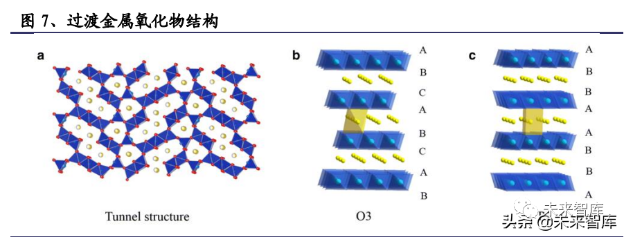 过渡金属氧化物分为隧道型和层状氧化物,其中后者极具商业应用前景。层状氧 化物具有 O2、O3、P2 和 P3 四种结构。P2 和 O3 两种层状氧化物有良好的结构以 供离子通过,电极材料比容量分别为 100mAh/g、140mAh/g,与硬碳组成的全电池 实际能量密度较高(超过 120Wh/kg)。但是,层状氧化物材料中选用部分过渡金 属仍然会存在结构稳定性和循环性能差的问题,需要通过引入活性或惰性元素进 行掺杂或取代。尽管如此,层状金属氧化物因为可以借鉴锂离子电池常使用的固 相法或共沉淀法实现低成本规模化生产,仍然是当前比较主流的正极材料,受到 中科海钠、钠创新能源、英国 Faradion 等公司的青睐。目前,P2 结构材料通过多 种元素混合形成的改进材料首圈比容量最高可实现 190 mAh/g。