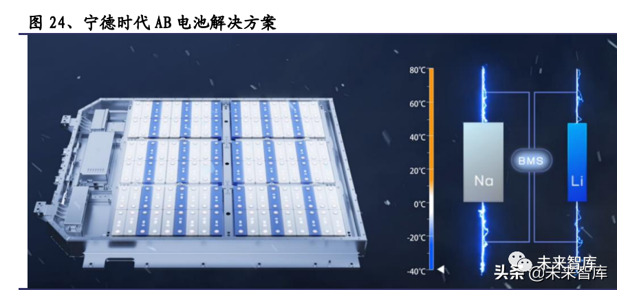 AB 电池系统解决方案助力突破能量密度瓶颈。宁德时代开发出钠离子电池与锂离 子电池混合集成共用的解决方案,将两种电池按一定的比例和排列进行混搭、串 联、并联、集成通过 BMS 的精准算法进行不同电池体系的均衡控制,这样可以实 现取长补短,既弥补了钠离子电池在现阶段的能量密度短板,也发挥出了它高功 率、低温性能的优势,为其进入高端电池领域创造有利条件。