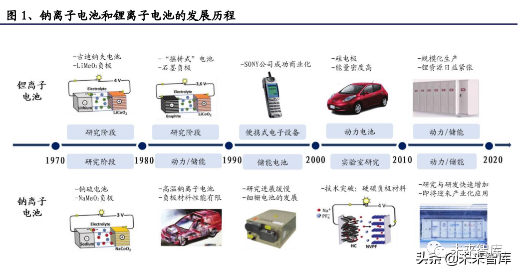 钠离子电池起步较早,但前期研究进展缓慢。钠离子电池从上世纪 70 年代起便得 到学术界的关注,甚至早于锂离子电池的研究。随着在 90 年代锂离子电池的成功 商业化,锂电池相继在消费、动力和储能等领域被广泛应用,而钠离子电池的发 展悄然中止。技术变革与锂资源约束推动钠离子电池复兴。21 世纪以来由于锂资源的稀缺和分 布不均,钠离子电池技术逐渐重新回到科研界的视野。背靠快速增长的新能源产 业,钠离子电池的相关研究突飞猛进,技术进步下钠离子电池的优势不断被发掘, 发展潜力逐步显现。