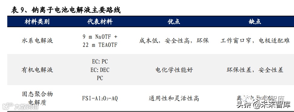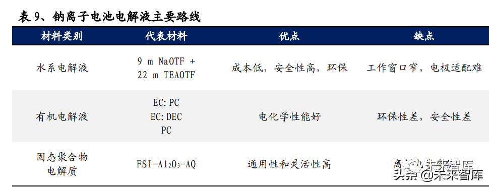 钠离子电池使用钠盐电解质,并不会颠覆现有锂电体系电解质格局。钠离子电池 仍以液体非水系电解液为主,根据正极材料搭配六氟磷酸盐或高氯酸盐电解质。钠离子电池电解液与锂离子电池电解液配方相似,均由电解质、溶剂和添加剂组 成,最大的区别是电解质由锂离子变为钠离子。六氟磷酸钠的生产反应工艺、设 备和过程成本和六氟磷酸锂基本一致,区别仅是其原料用钠盐替代了碳酸锂。天赐材料、新宙邦、多氟多等公司已拥有钠离子电解液的技术储备,钠离子电池电 解液的生产体系可全部沿用现有锂离子电池体系,可共享产能。