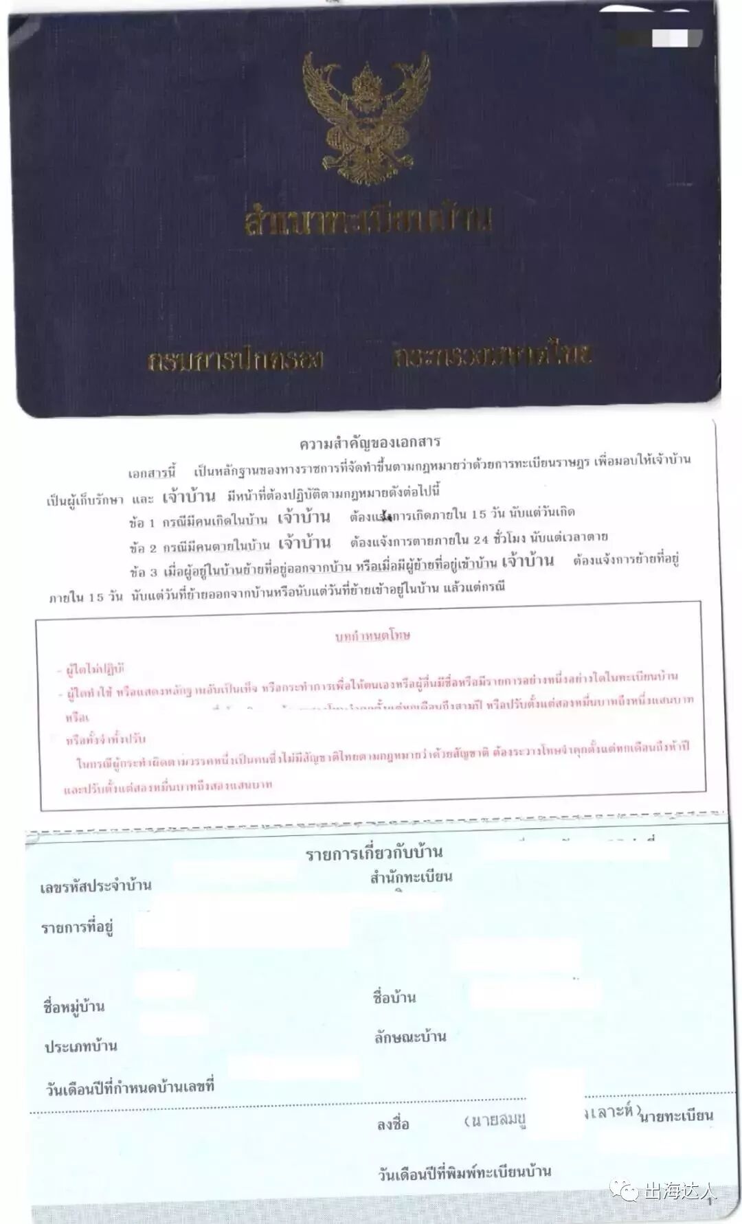 房屋户口本是泰国政府颁发的用于登记房屋业主的小簿子,用来登记房产详情信息,包括房屋代码、开发商、房产名称、房产类型和描述,以及房屋编号日期。