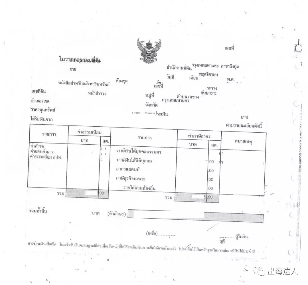 泰国的地契以泰文书写,正面为过户单元的信息,公寓地址、项目名称、楼层、建筑面积、公寓注册号、公寓户型以及开发商信息等详细资料。