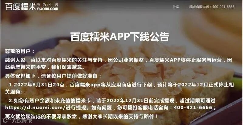 日前,百度糯米官网发布了下线公告。公告显示,因公司业务调整,百度糯米APP将停止服务与运营,预计将于2022年12月正式停止相关服务。