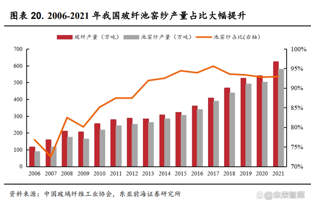 池窑法占比逐步提升,落后产能淘汰带来替代式发展空间。由于池窑 法相较坩埚法优点众多,近年来池窑纱产量占比大幅提升,从 2006 年的 76.8%提升到 2021 年的 92.9%,但仍有约 7%的产量是由坩埚法生产。随着 《产业结构调整指导目录(2019 年本)》与 2020 年《玻璃纤维行业规范条 件》对坩埚法产线进行限制,预计老旧的坩埚法产线将逐步退出,或被替 换为池窑法产线,行业供给或面临结构性缺口。