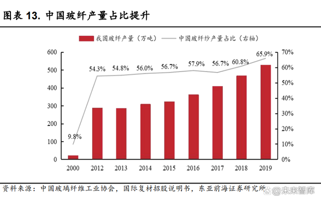 (3)成熟期(2009 年至今):目前我国已建立了完整的玻璃纤维原料、 制造、装备等配套体系,形成了具有中国特色的玻璃纤维生产方式。中国 玻璃纤维工业已经成为世界玻璃纤维制造行业的领头羊和发动机,根据中 国玻璃纤维工业协会统计,2019 年我国玻纤产量已占世界玻纤产量的 65.88%。