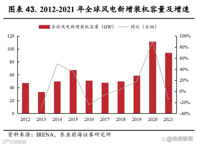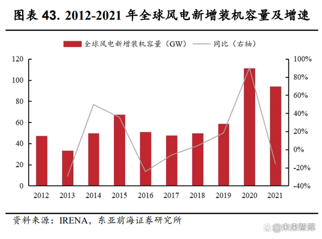 “双碳”政策引领下,风电行业持续景气。在全球节能减排的持续推进和我国“双碳”目标的引领下,2020年以来风电产业高速发展。2020、2021年全球新增风电装机容量分别为111.03GW、93.6GW,较2019年水平分别增长 90.1%、60.2%。其中,2020、2021年我国新增风电装机容量分别为71.67GW、45.57GW,较 2019 年水平分别增长 178.4%和 77.0%。