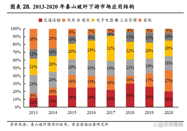 我国玻纤下游应用以建筑为主,新兴领域增长潜力较大。据华经 产业研究院数据,建筑为我国第一大玻纤应用领域,2020 年建筑领域 玻纤消费占比达 34%;其次为电子电器,占比为 21%;交通运输、管 道、同业应用占比分别为 16%、12%和 10%,而新能源环保占比仅为 7%,增长潜力较大。随着新能源行业高速发展与国家政策发力,未来 新能源环保占比有望持续提升。玻纤行业龙头持续向新兴领域渗透。近年来我国玻纤企业持续向高端 化发展,发力新兴领域。以泰山玻纤为例,2013 至 2020 年,泰山玻纤下游 交通领域需求占比从12%提高至20%,风电领域需求占比由6%提高至27%, 建筑领域则相对稳定。玻纤龙头需求结构的优化,体现了我国玻纤产业需 求结构高端化,行业龙头不断向新兴领域发展迈进的过程。
