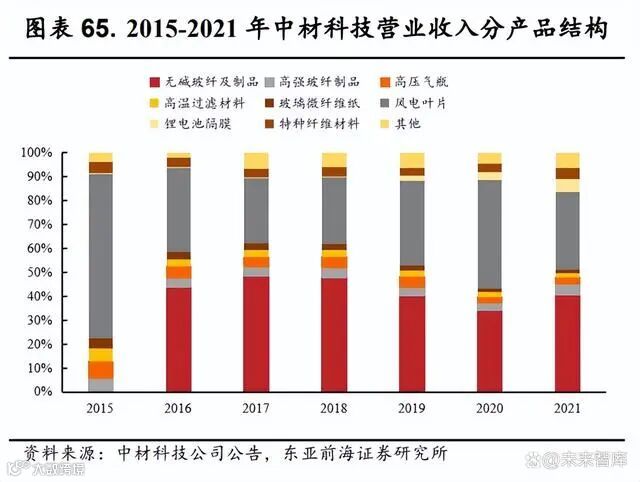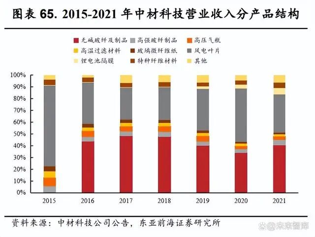 公司充分发挥产业协同效应,产品结构持续优化。公司于 2007 年成立 中材风电,正式进军风电叶片行业;2015 年起开始培育锂电池隔膜业务;2016 年正式收购泰山玻纤,实现玻纤产业与风电叶片协同发展。玻纤为风 电叶片主要原材料之一,公司生产叶片使用的玻纤主要来自于泰山玻纤, 价格稳定,供应链保障性强,此外,泰山玻纤研发的高模玻纤可适配大型 化的风电叶片,支持公司风电叶片产品的迭代升级。2021 年公司无碱玻纤 制品,风电叶片和锂电池隔膜业务营收分别为 87.52、69.76 和 5.76 亿元,营收占比分别为 40.7%、32.5%和 5.2%,2017 至 2021 年年均复合增长率分 别为 10.85%、18.89%和 81.55%。公司整体营收结构较为均衡,锂电业务占 比有所提升。
