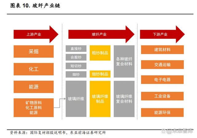 玻纤上游原料便于获取,下游应用较为广泛。玻纤生产的原材料主要 为矿物原料和化工原料,包括白泡石、叶蜡石、高岭土、石英砂、石灰石 等,均为我国储量较大的矿物,获取难度较小;使用能源主要为电力和天 然气;下游应用较为广泛,主要包括建筑材料、交通运输、电子电器、工 业设备、能源环保等领域。