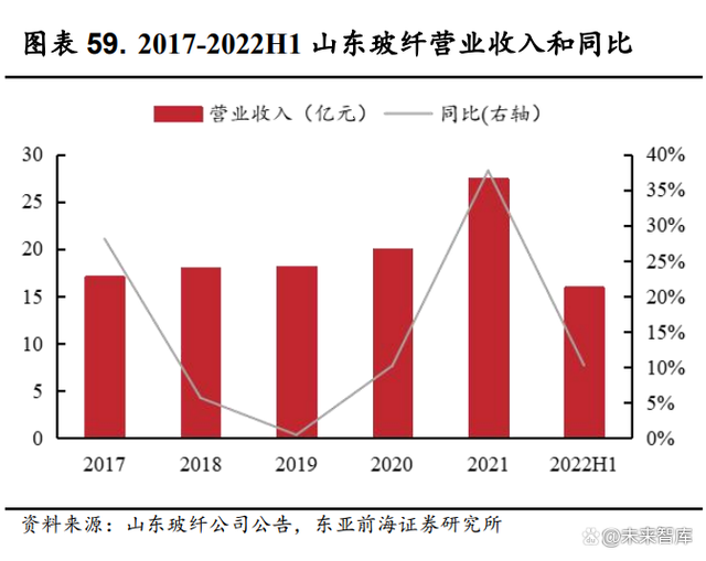 山东玻纤为国内玻纤行业后起之秀。山东玻纤成立于 2008 年,由山东 省国资委控股,控股权集中,是国内玻纤企业后起之秀。公司立足交通发 达的沿海地区,不断健全产业链,布局原材料与能源产业,生产成本持续 下降。业绩方面,2021 年公司实现营业收入 27.59 亿元,同比增长 37.72%;实现归母净利润 5.46 亿元,同比增长 216.78%。2022 年上半年公司实现营 业收入 15.95 亿元,同比增长 10.27%;实现归母净利润 3.48 亿元,同比增 长 5.27%。