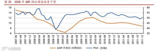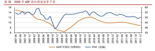 受国际金融危机的影响,外部需求明显收缩, 2008 年下半年经济增长下行的压 力明显加大。GDP 同比增速第一季度到第四季度逐季下滑,分别增长 10.6%、10.1%、 9%和 6.8%。为了应对危局,中国政府于 2008 年 11 月推出了进一步扩大内需、促进 经济平稳较快增长的十项措施。四万亿计划出台后,我国经济预期逐步修复。
