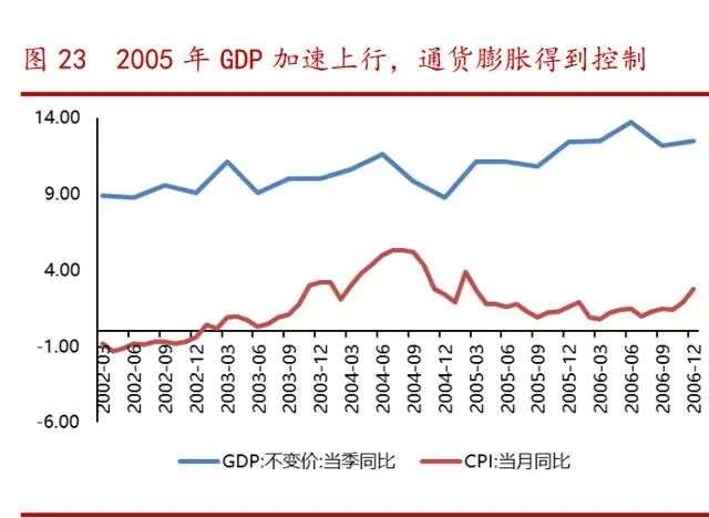 2005 年除了 GDP 增速进一步加速上行外,同时经济运行还有两个特点,一是固 定资产投资增速降温,2004 年的“经济过热”得到控制,另一方面,通货膨胀得到 了有效控制。2005 年 GDP 实际增速 11.4%,连续第四年加速上行,而 CPI 则基本运行 在 2%区间。