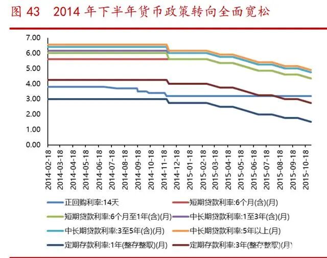 3)2014 年底受国际环境的影响,在不断恶化经济环境下,央行货币政策从定向 宽松转向全面宽松,此次超预期的降息直接垂直拉升了券商板块,引爆 2014 年底的 市场行情。2014 年 11 月,央行采取非对称方式下调金融机构人民币贷款和存款基准 利率。其中,金融机构一年期贷款基准利率下调 0.4 个百分点至 5.6%;一年期存款 基准利率下调 0.25 个百分点至 2.75%。