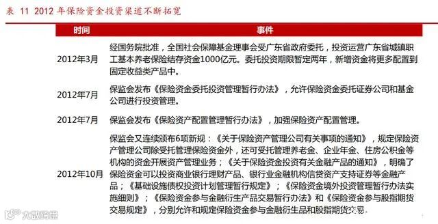 2012 年出台的关于保险资金运用的基础性规章,拓宽了保险公司的投资渠道。允许证券公司和基金公司为保险公司提供资产管理服务,进一步放宽保险资金投资债 券、股权和不动产的品种、范围和比例的限制,给予保险公司更大的资金运用空间。