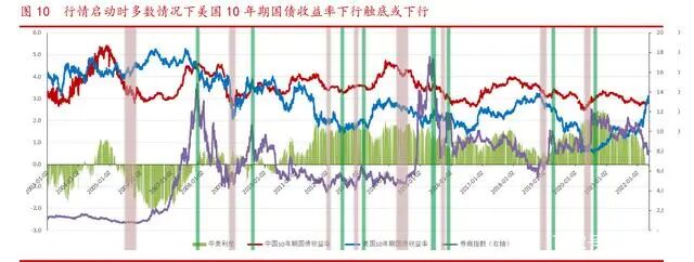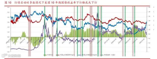 8 次券商行情中 6 次发生于美国 10 年期国债收益率下行触底或者下行过程中, 中美利差上升或稳定,中美货币经济周期一致。只有 2 次例外,分别是 2005 年 7 月 以及 2012 年 11 月。2005 年券商行情启动于 7 月份,彼时中国 10 年期国债收益率持续下行,而美国 10 年期国债收益率持续上行。通常情况下美国加息或缩表周期下,新兴资本市场表 现有较大压力,我们认为 2005 年 6 月 A 股市场之所以迎来行情启动,主要原因在于 2005 年汇改背景下人民币进入长期升值通道,虽然中美利率倒挂,但资金仍然是净 流入的。此外当时虽然上市公司整体业绩有压力,但是中国宏观经济并不差;另外 2005 年 6 月行情启动前市场已经有了长达四年的调整,市场整体估值处于极低位 置。2012 年 12 月券商行情的启动时美债收益率小幅上行,10 年期美债收益率从 2012 年 12 月的 1.6 左右上行至 2013 年 2 月的 2.0 左右。但整体上行幅度不大而且 持续时间并不长。同时我们认为本轮券商行情也是上半年行情的延续。