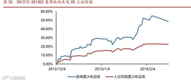 此轮行情上涨并不典型,推动力主要来自证券行业创新带来的行业阿尔法。2011 年 10 月底,郭树清就职证监会主席。2012 年上半年,加快改革、放松管制、鼓励创 新成为证券业乃至资本市场发展的主基调。2012 年 5 月的券商创新大会,出台《关 于推进证券公司改革开放、创新发展的思路与措施》。行业创新和监管放松推动了券 商两融和资管业务发展,同时净资本监管指标的完善为行业加杠杆创造了条件,行业 阿尔法触发券商上涨行情。