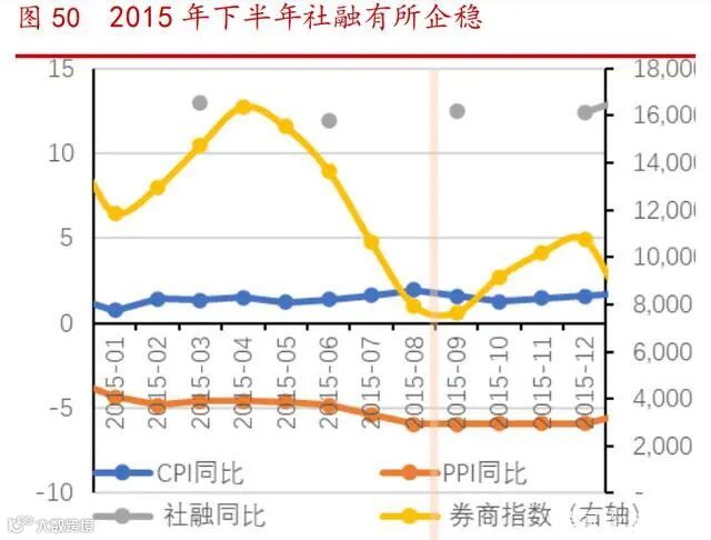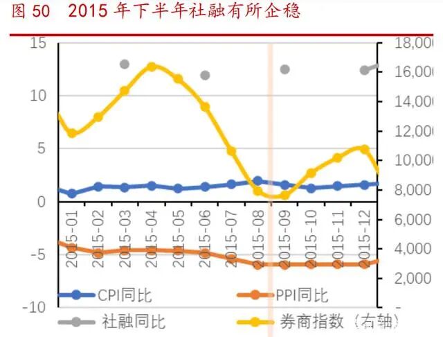 复盘历次券商行情,8 次行情均启动于宏观经济衰退后半段或复苏前半段,也就 是通胀下行、经济触底或企稳的过程中,这也符合美林投资时钟的结论。8 段行情 中有 7 段启动 于 CPI、PPI 下 行(或低 位走平 )阶段 ,只有 2012.11~2013.2 行情启动时 CPI、PPI 已经越过下行阶段,处于上行过程中。然而事 实上本轮行情我们更愿意定义为前一轮 2012.1~2012.6 行情的延续,2012 年上半年 在证券业创新驱动下证券行业有一波持续时间较短的行情,但市场对于行业创新及效 果仍然抱有怀疑态度,加之欧债危机发酵行情终止,2012 年下半年证券业创新细则 陆续落地,以及宽松的货币流动性配合,行情再次启动。8 轮行情中有 7 次工业企业利润位于触底前夜(4 个月内数据回升)或者触底企 稳阶段,只有一个例外是 2014.3~2015.5,行情启动之时,社融与工业企业利润仍然 处于漫长的下行通道,行情启动于 2014 年 6 月,但事实上一年后社融与工业企业利 润才企稳回升。