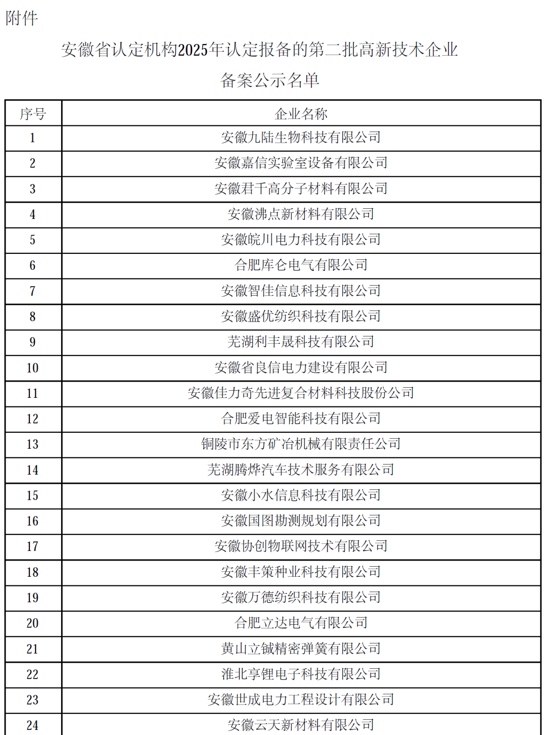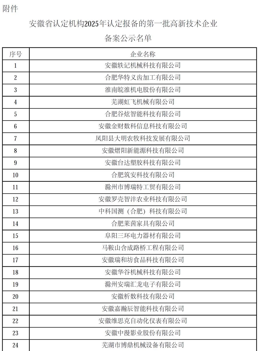 对安徽省认定机构2025年认定报备的第一批高新技术企业进行备案的公示