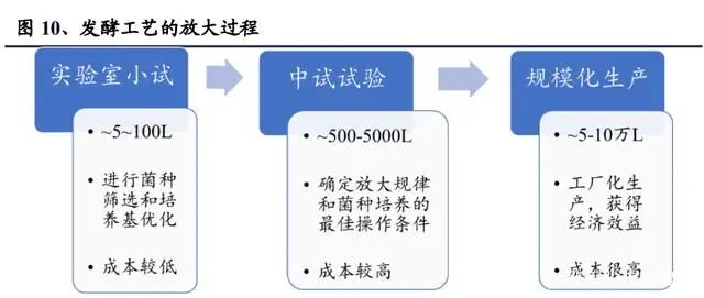 生产规模扩大是合成生物学产品是否能够实现产业化的关键环节,但是这并不是 一个全新的课题,传统的发酵工业中也是利用具有特定功能的细胞来进行产品生 产的。合成生物学产品的生产规模放大的过程,就是生物发酵的放大过程,由 “实验室小试-中试试验-规模化生产”三个阶段组成。