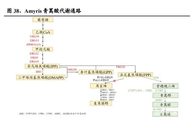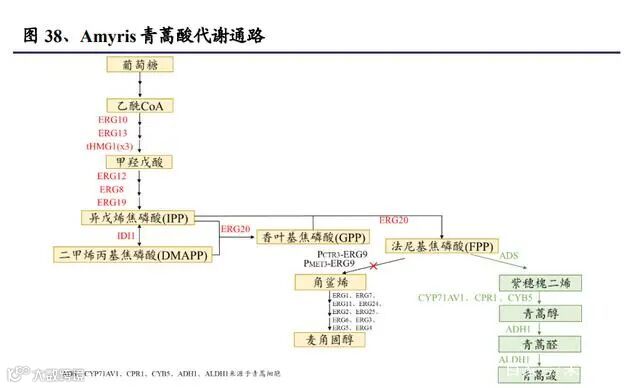 研究者对化学合成青蒿素进行了多年的探索,但由于青蒿素的化学结构较复杂, 合成方法步骤繁琐,生产成本高,收率低,暂时仍远未达到工业化生产的要求。而 Amyris 利用合成生物学方法改造酿酒酵母,使其生产青蒿素前体—青蒿酸, 而青蒿酸经过比较简单的化学反应就可以生成青蒿素,这种方法叫做半化学合成 法。经过多年改造,青蒿酸的产量提高到了 25g/L。酿酒酵母本身可以通过甲羟戊酸途径将乙酰辅酶 A 转变为法尼基焦磷酸(FPP), 甲羟戊酸途径是细胞合成类固醇、萜类化合物的途径。研究者们上调了甲羟戊酸 通路上的 ERG10、ERG13、tHMG1、ERG12、ERG8、ERG19、ERG20 等酶,提 高 FPP 的产量。随后,研究者在酿酒酵母中引入了来源于青蒿细胞的 ADS,可 以将 FPP 转变为紫穗槐二烯,接着还引入了同样来源于青蒿细胞的 CYP71AV1、 CPR1、CYB5、ADH1、ALDH1 等基因,逐步合成青蒿醇、青蒿醛和青蒿酸。研 究者还下调了支路途径中 ERG9 的表达,下调了 FPP 向角鲨烯的转化,最终使青 蒿酸产量达到 25 g/L。