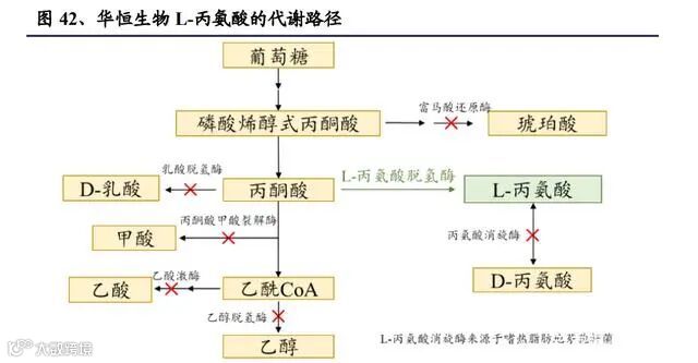华恒生物的研究者们将嗜热脂肪地芽孢杆菌中的L-丙氨酸脱氢酶基因整合在大肠 杆菌的乳酸脱氢酶处,使大肠杆菌内的丙酮酸转化为L-丙氨酸;再依次敲除大肠 杆菌染色体的丙酮酸甲酸裂解酶、乙醇脱氢酶、乙酸激酶、富马酸还原酶和丙氨 酸消旋酶基因,阻断丙酮酸其他的下游代谢通路;构建出了L-丙氨酸产量115g/L 的菌株,可以工业化发酵法生产 L-丙氨酸。