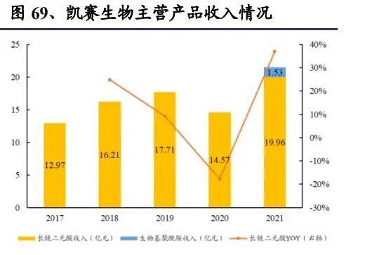 长链二元酸通常是指碳链上含有十个及以上碳原子的脂肪族二元羧酸,其结构通 式为:HOOC-(CH2)n-COOH(n=10~18),缩写形式为:DC10~DC18。目前 凯赛生物长链二元酸年产能 7.5 万吨,还有年产能 4 万吨的癸二酸在建,预计 2022 年上半年投产。长链二元酸传统上以化学法生产为主,在凯赛长链二元酸生产之前,全球长链二 元酸市场主要包含化学法生产的 DC12(月桂二酸),产能约 2 万吨/年,主要生 产厂家为杜邦,后转给英威达。在近年的市场竞争中,以英威达为代表的传统化 学法长链二元酸逐步退出市场。凯赛是目前世界上长链二元酸产品最主要的供应商,国内市占率 95%,包含癸二 酸在内的长链二元酸产能全球市占率 50%、不包括癸二酸的长链二元酸全球市占 率达 80%,主要客户包括杜邦、艾曼斯、赢创、诺和诺德等全球著名化工、医药 企业。