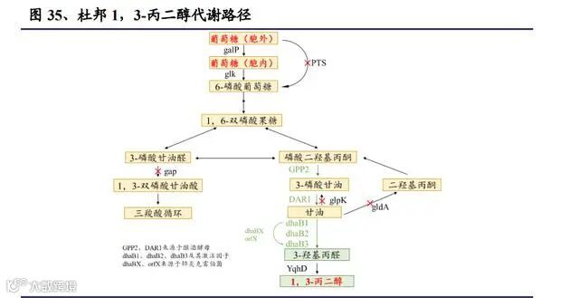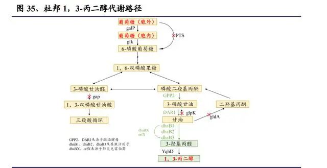 1,3-丙二醇的生产技术主要有化学法和生物发酵法两种。化学法以德固赛的丙 烯醛水合氢化法和壳牌公司的环氧乙烷羰基化法为代表。由于原料不可再生、生 产过程污染严重、生产成本高等因素,这两家公司当前已经退出 1,3-丙二醇市 场。生物法因为具有反应条件温和、过程绿色无污染、生产成本低、产物易于分离、 合成的 PTT 色泽较化学合成法更好等优点,现在已经成为生产 1,3-丙二醇的主 流工艺,以杜邦的发酵工艺为代表,杜邦在 1,3-丙二醇行业依靠其成本优势、 产品优势处于垄断地位。杜邦以大肠杆菌为底盘,构建了将葡萄糖转化为 1,3-丙二醇的细胞。自然界中 不存在可以直接将葡萄糖转化为 1,3-丙二醇的微生物,但是存在可将甘油转化 为 1,3-丙二醇的微生物,也存在可以将葡萄糖转化为甘油的微生物,将这两种 代谢路径结合起来就可以达到在微生物中将葡萄糖转化为 1,3-丙二醇的目的。