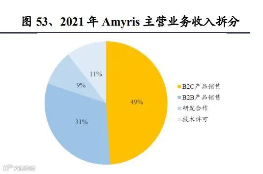 2018 年 Amyris 主营业务收入为 0.54 亿美元,2021 年为 1.88 亿美元,2018-2021 年 CAGR 51.56%,预计 2022 年主营业务收入可达 3.6 亿美元,但是目前 Amyris 仍未实现盈利。2021 年主营业务收入中 49%来源于 B2C 业务,51%来源于 B2B 业务。B2C业务中,又以护肤和个护领域对收入贡献最大,在B2C收入中的占比 从 2019Q1 的 19%增长到 2022Q1 的 60%。B2C 业务近几年增长速度很快,带动业绩快速增长,预计 2022 年 B2C 业务收入 和 B2B 业务收入将分别实现 150%和 40%的增长。