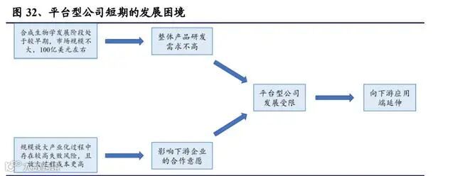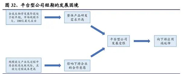 中游是平台型公司,负责对人工生命体进行设计、开发,为传统企业开拓新的价 值领域。目前合成生物学整体发展阶段仍处于较早期,市场规模还不大,对产品 研发的需求并不大,许多下游企业通过与科研机构合作就可以满足生物基产品的 研发需求。而且目前合成生物学在规模放大的产业化过程中仍存在较高失败风险, 也会影响下游企业与平台型公司合作的意愿。仅依靠平台为客户提供研发服务,目前还不足以支撑平台型公司的发展,因此许 多平台型公司将自己的平台技术在具体应用场景中延伸,打造落地产品。国外已有多家代表性平台型公司上市,但是研发服务的盈利模式还未得到完全验 证。随着合成生物学整体市场规模的增长以及相关技术的突破,未来平台型公司 依靠强大的研发能力有望取得较好的发展前景。