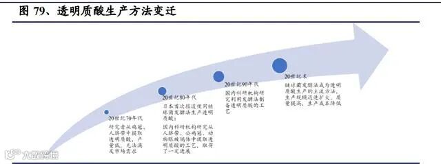 透明质酸是存在于人体和动物组织中的一种天然直链多糖,作为细胞外基质的主 要成分,人体内主要分布于眼玻璃体、关节、脐带、皮肤等部位,发挥重要生理 功能。透明质酸具有良好的保水性、润滑性、黏弹性、生物降解性及生物相容性 等理化性能和生物功能,在医疗、化妆品及功能性食品领域中应用十分广泛。20 世纪 70 年代,研究者开发了一种从鸡冠和人脐带中分离纯化透明质酸的工艺, 但产量较低,难以满足不断扩展的终端应用市场。20 世纪 80 年代,日本首次报 道使用链球菌发酵法生产透明质酸。同时,国内科研机构开始研究从人脐带、公 鸡冠、动物眼玻璃体中提取透明质酸的工艺。20 世纪末,链球菌发酵法成为透明质酸生产的主流方法。因为发酵技术的引入, 透明质酸的生产规模得以迅速扩大,质量显著提高,生产成本显著降低。