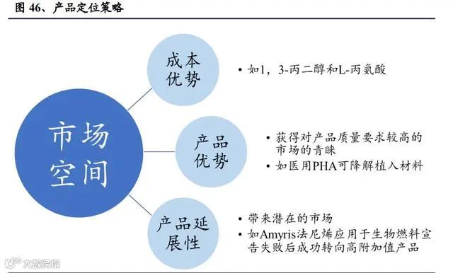 选品是合成生物学企业是否能够获得成功的关键。例如,杜邦的 1,3-丙二醇、 华恒生物的L-丙氨酸在利用合成生物学手段合成后成功地占据了比较好的市场地 位。而 Amyris的生物柴油、Zymergen的 Hyaline是比较失败的选品案例,在宣告 失败后也都造成了股价的大跌。在进行选品时,可能需要从产品定位、合成生物 学方法的适用性和政策监管等多维度综合考虑。在产品定位方面,首先需要明确产品的潜在市场空间,对于创造新需求的产品来 说,可能需要进行全面的市场调研,严谨地测算未来可能的市场空间,如 Zymergen 错误地估计了可折叠屏的市场,导致 Hyaline 选品的失败。测算未来可 能的市场空间时需要对以下几点进行细致考量:1)产品是否有明确的成本优势, 如1,3-丙二醇和L-丙氨酸的生物合成法具有明显的成本优势;2)产品是否有明 确的产品品质优势,即产品即使在成本方面没有优势时,也可获得对产品质量要 求较高的市场的青睐,如医用的 PHA 可降解植入材料;3)产品的延展性也是测 算产品潜在市场空间的重要因素,以 Amyris 的法尼烯为例,除了可以加氢生成 法尼烷用作生物燃料外,还可以通过偶联、蒸馏生成角鲨烷,通过其他简单的化学反应制备某些香料、香水的成分。因此,即使 Amyris 的法尼烯应用于生物燃 料宣告失败后,这些后续的应用延展,也给 Amyris 带来了可观的业绩增量。