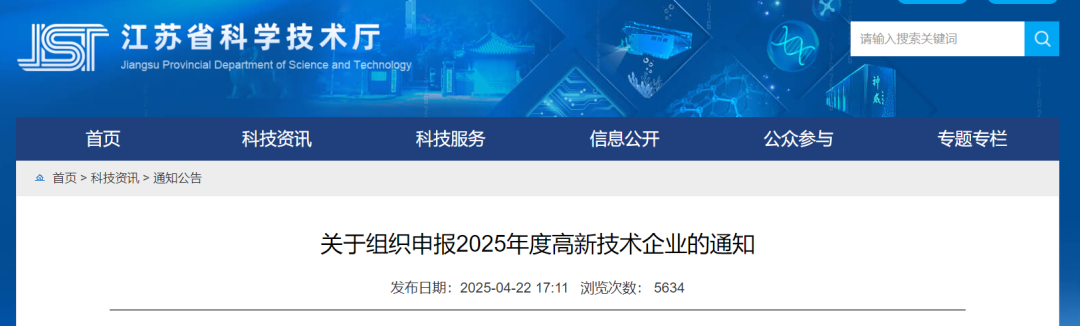 申报通知(点击查看):江苏省高新技术企业认定管理工作协调小组办公室 关于组织申报2025年度高新技术企业的通知 苏高企协办〔2025〕1号